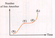 NOTE: Q 4 + 5 will use the same Graph ! The opposite graph represents the number of free Amoebae that are present in a pond, study it then answer : 4- At which point will the oxygen start to decrease in the pond?